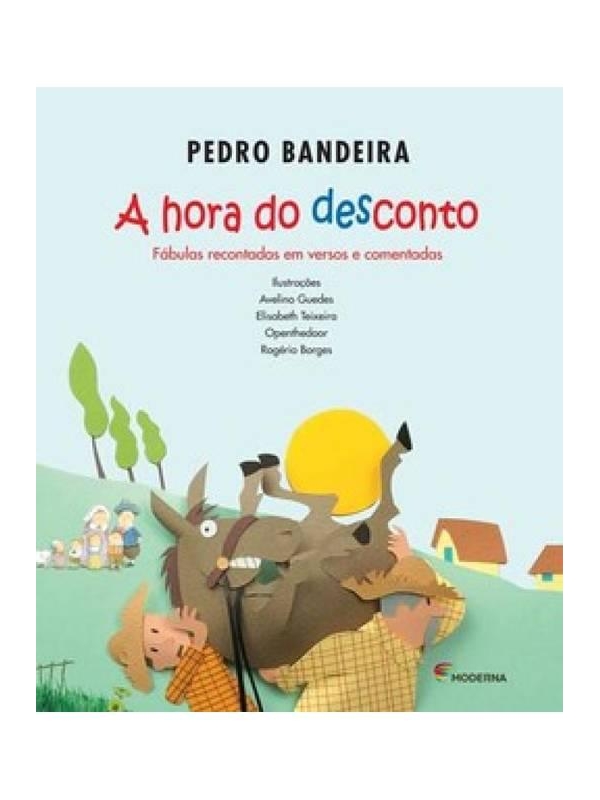 - Em " A hora do desconto" , o leitor vai encontrar doze bons motivos para se divertir com as fá bulas recontadas em versos encharcados do humor irreverente que é a marca, nã o de uma lá grima, mas de muito riso, de Ped ro Bandeira. Das doze, cinco sã o de Esopo. " A corrente de amor" , de Jú lio Din