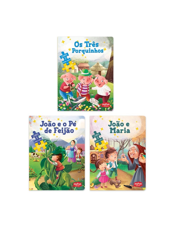 - Reviva a magia de Os Três Porquinhos, João e Maria e João e o Pé de Feijão em livros lindamente ilustrados! Cada título vem com 3 quebra-cabeças de 15 peças com cenas das histórias — diversão garantida enquanto as crianças leem e brincam. Além disso, reforçam a compreensão da narrativa, estimulam a
