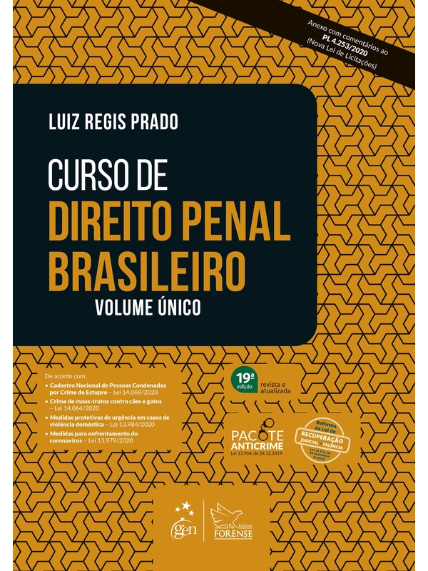 - Direito Penal Brasileiro atualizado com o Pacote Anticrime. Com soluções práticas e análise detalhada da doutrina, Luiz Regis Prado aborda as Partes Geral e Especial do Direito Penal e oferece quadros sinóticos e decisões gráficas de tribunais superiores. De acordo com a Emenda Constitucional nº 104