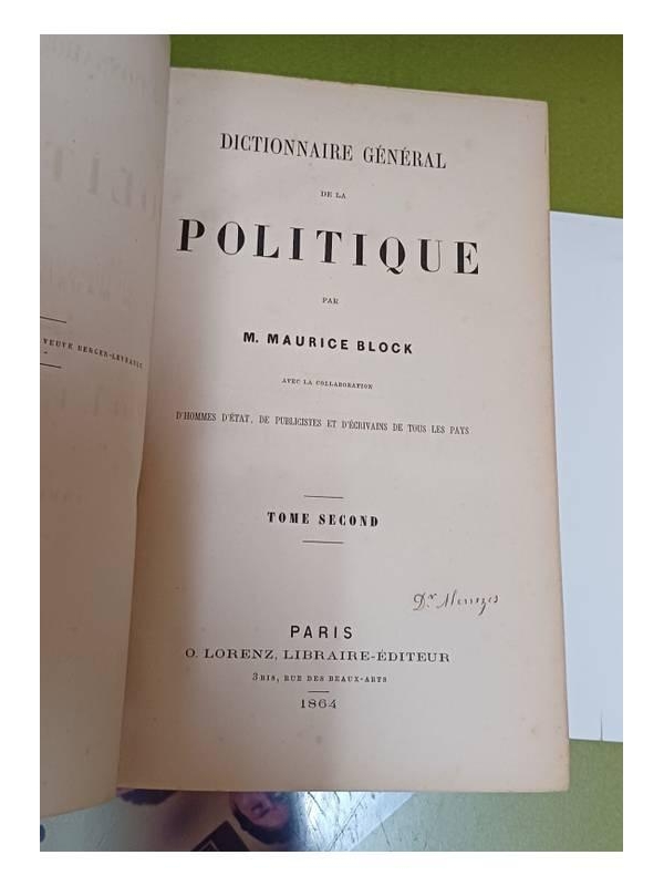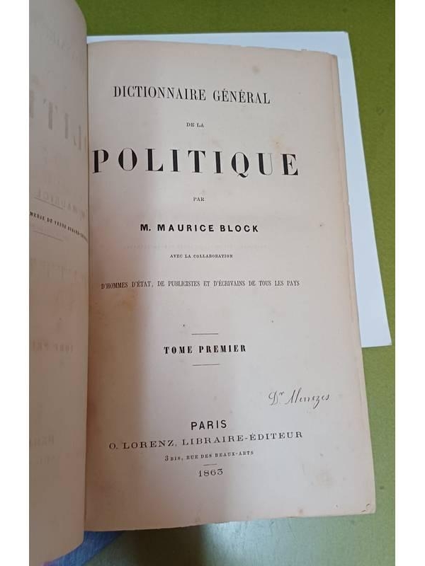 - Dimensões: 16 x 25 cm, volume 1: 1176; volume 2: 1140 p. Capa dura nova, preta, gravação dourada na lombada (vide foto real), miolos ótimos, sem marcas de leitura, cortes um pouquinho escurecidos do tempo. Pequenina assinatura de posse na folha de rosto. Sinopse: O "Dictionnaire Général de la Politi