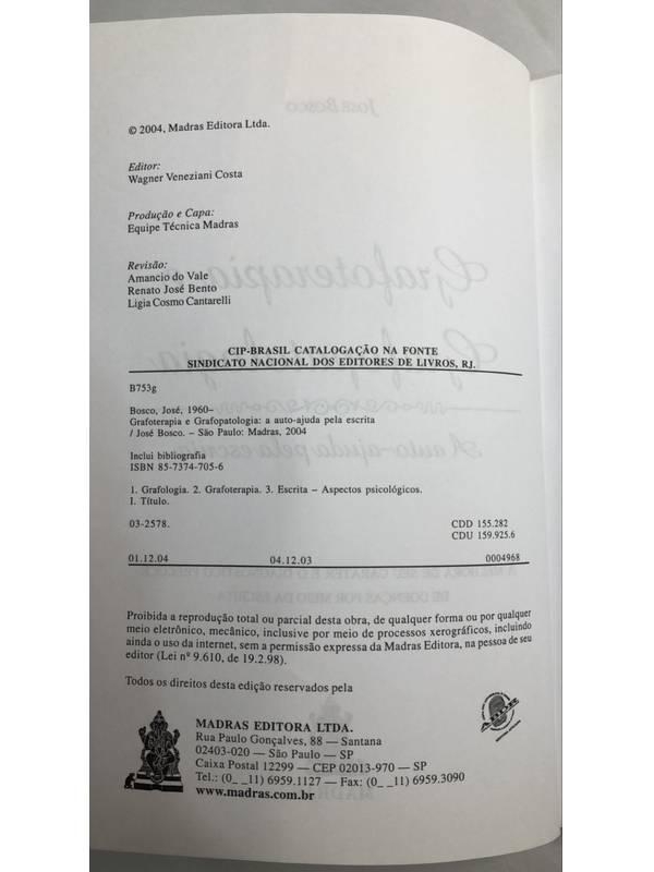 - SKU: 32640130. Condição: USADO. Acabamento: Brochura, Página: 187. Exemplar em ótimo estado, sinais de manuseio sobre as bordas, conteúdo livre de grifos e rasuras. --- Grafoterapia e Grafopatologia - A Auto-Ajuda pela Escrita é um livro que pretende levar ao leitor as informações mais importantes a