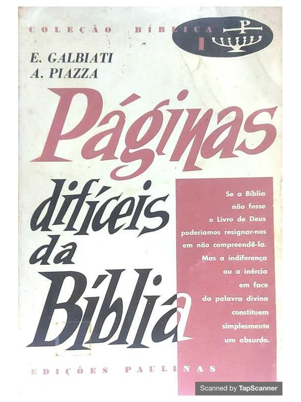 - Páginas difíceis da Bíblia . E. Galbiati . A. Piazza . Edições Paulinas . 1959 . 332 páginas . brochura em bom estado . Amassados na parte superior da capa e adesivo transparente na capa e contra capa . sem sublinhados